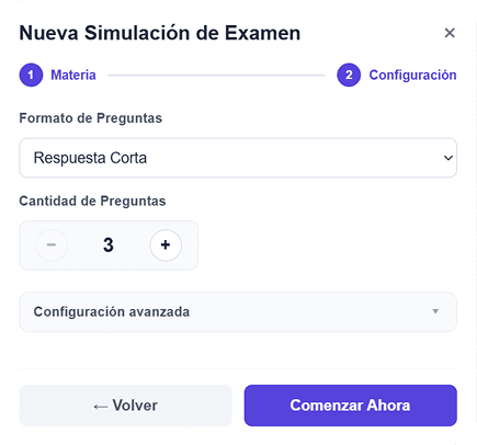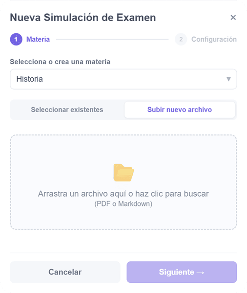 Cargá tus apuntes y configurá el simulacro. En menos de un minuto tenés tu examen listo.